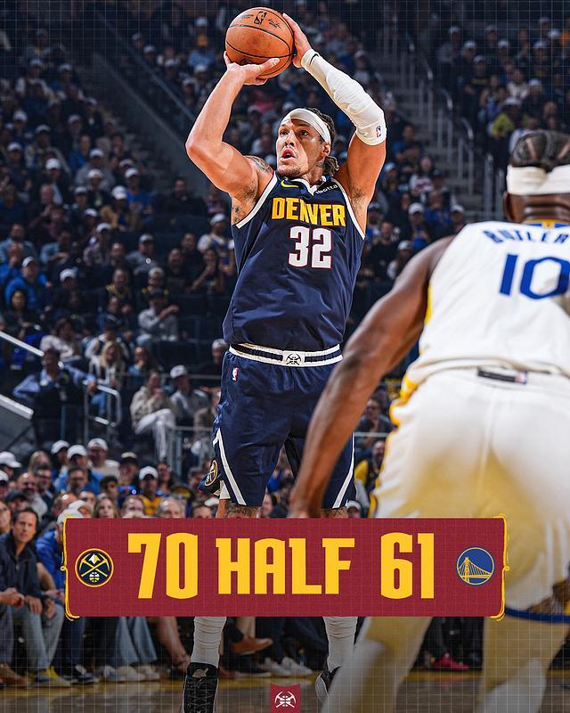 北京时间10月24日,NBA常规赛继续展开,勇士主场对阵掘金。本场比赛勇士上来率先进入状态,取得10-0开局,可掘金立马回敬一波12-0攻势,之后也是占据场上主动,勇士也能咬住;可在第二节掘金进攻势头火热,戈登外线接连命中三分,一度取得14分领先,最后勇士连续追分,半场打完61-70落后掘金。